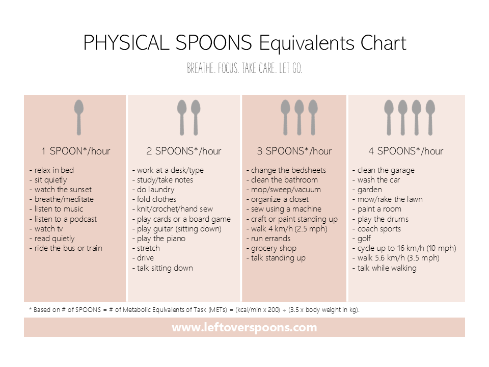 The following PHYSICAL SPOONS Equivalents Chart, for Spoon Theory 2.0, was produced by combining elements from the Original Spoon Theory with Metabolic Equivalents of Task (METs):