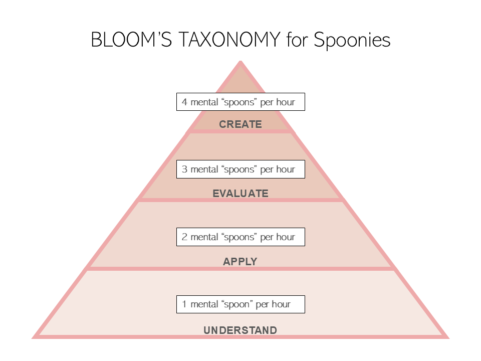 In developing Spoon Theory 2.0, I took the liberty of reducing the pyramid’s number of levels from 6 to 4 to create the following simplified version of Bloom’s Taxonomy: